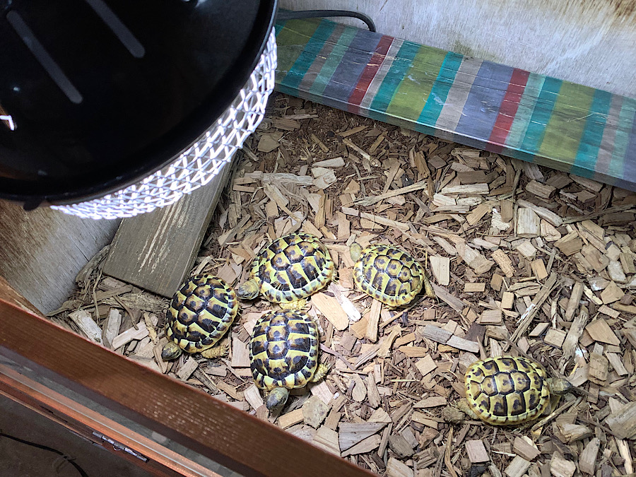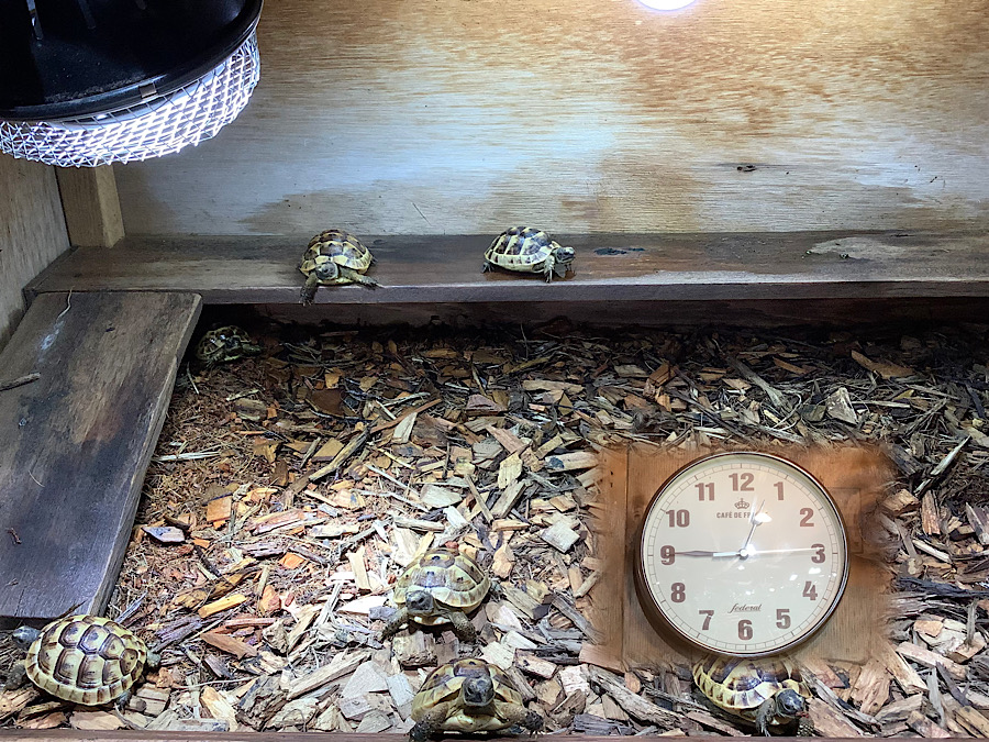 電気が消える19時までカメたちはメタハラに当たって日光浴をしたり、ベースの上で昼寝をしたり、登ったり降りたりやりたい放題だ。18時30分ごろエサ皿は回収して1日の作業は終了。これがかめぢからのリクガメの動き、1日の生活である。カメが元気に歩き回るような飼育をしたい人、偏食なくエサを何でも食べる個体に仕上げたい人はかめぢからで学ぼう。
