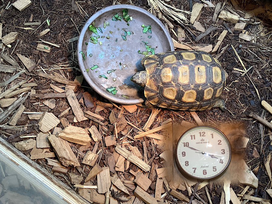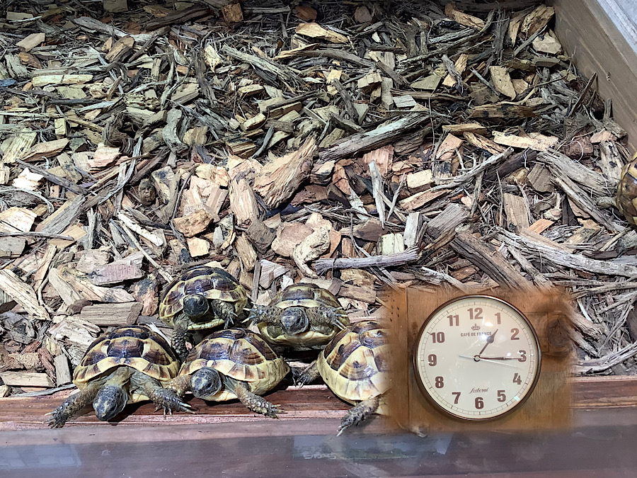 エサを用意している間は落ち着きがなく動き回る。頭の良い個体はケージのガラスにへばりついてエサを用意している様子をずーっと見ているようだ。かめぢから研究によると、リクガメは視覚に頼った生活しているが、目の前の物はよく見えていないらしい。5㎝ほどの個体では30cmくらい前が一番よく見えているようだ。数十センチ先にエサを見つけて歩いて近づく、すぐ近くまで来ると嗅覚にシフトし、エサかどうか判断する。目の前にエサがある個体の前方30cmくらいに別のエサを置くと目の前のエサは無視して先にあるエサの方に駆け寄ってくる。つまり視覚優位であり、近すぎる物はあまりよく見えていない事になる。こんな感じで専門書にも学術論文にもYoutubeにもない知識と技術を店頭で教えている。