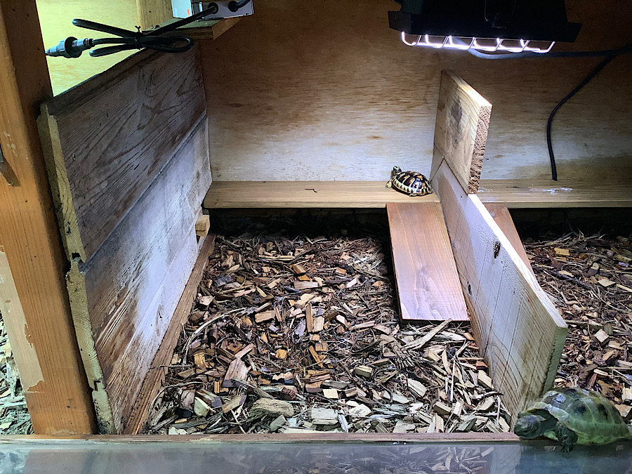 電気が点く前から活発に動き回っている強者もいるが、だいだい電気が点いてみんな動き始める。最初は寝ぼけた感じ。スポットライトではないライトの真下でバスキングしている姿に注目してほしい。
