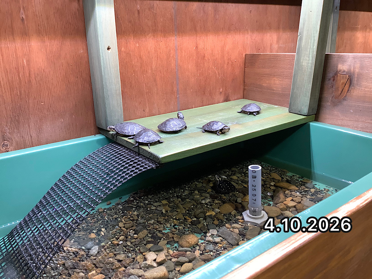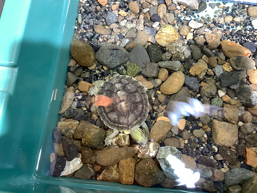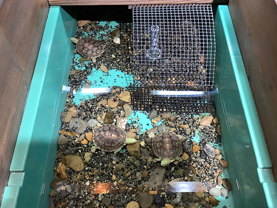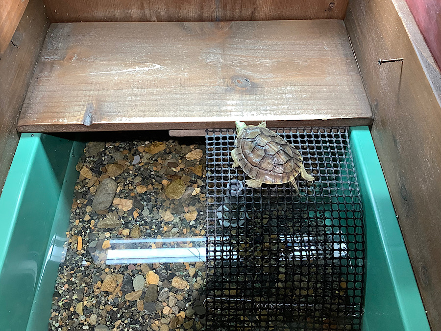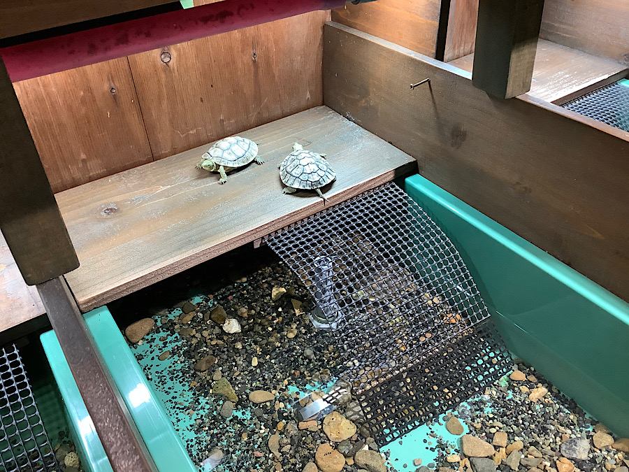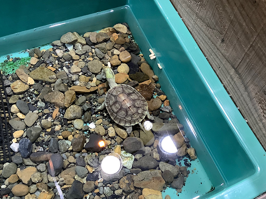 水の汚れや個体の状態を見て週4日~5日ほどエサやり。人の顔色を窺いつつエサを食べる個体がまだ多いのでエサを投入した後は私は退避してます。そ~っと除くと写真のようにパクパク食べています。ライト点灯11時、12時半頃にラフィP natureを与え16時頃に乾燥エビを与えます。部屋を覗くとかなり高い確率で上陸して日光浴しているので陸場は必須。空間に一切の無駄がないかめぢからベースでの飼育を参考にしてください。19時に消灯、水が濁ったり汚れる様子はほとんどありませんが、水替えは週1ペースで行っております。