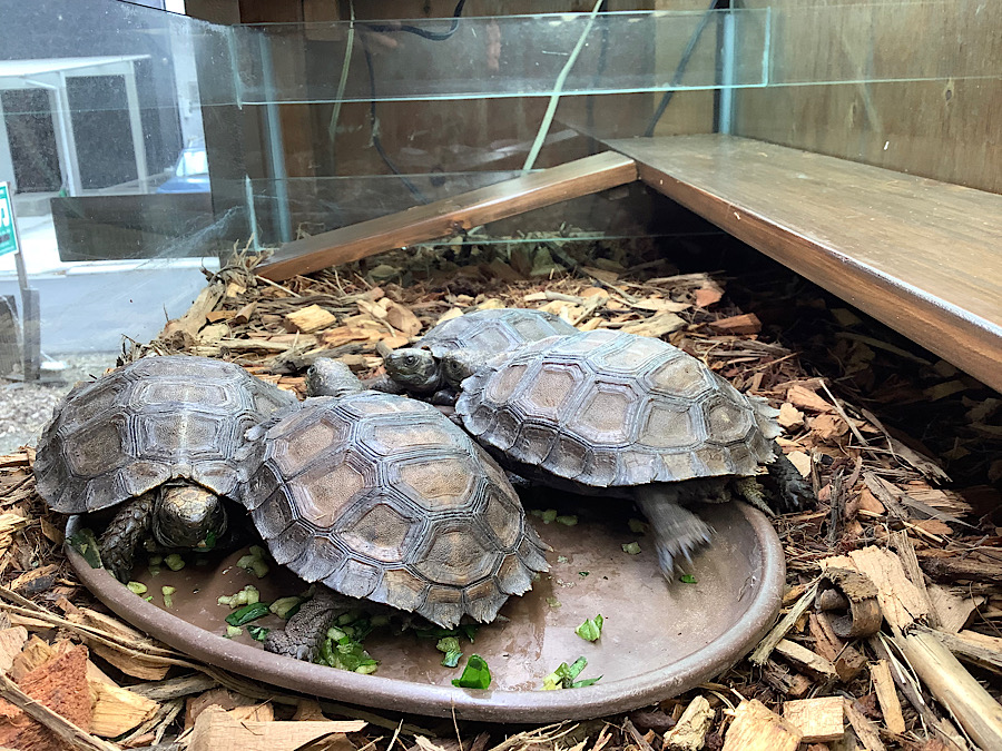 エサ食い撮影難関種。カメラを向けると勢いよく近寄ってくる。元気が良すぎて撮影できない代表的な個体たちがこのビルマムツアシ。神経質などと言われるビルマだがそんな気質は当社の品質においてはない。写真を見ればわかる。目が合った瞬間、仲間かき分けてこっちに向ってくるんだよ。怖ええよ。気になる個体がいたらご来店予約を入れてお店まで見に来てくれ。上にあるのがビルマ君たちのルーティン。13時30分~15時までのエサやり時間は多忙を極める。できるだけ避けてご来店予約を入れてくれ。だが、エサを食べている姿を見たいという客人も多いだろう。この時間にご来店希望の場合はエサやりを手伝ってもらう事にする。お子様はカメにエサやりができると大喜びの時間だ。リクガメ君たちの生活はリクガメの飼育方法を見てみてほしい。詳しいリクガメ飼育方法はご来店時になんでも教えてあげよう。リクガメの飼育設備を揃えてない人はかめぢから飼育セットで問題なし。セッティングまで頼んでオーダーしよう。当店以外で飼育設備を揃え、初会ご利用の客人にはご来店予約時に準備している飼育環境の写真を送っていただく。では、よろしく頼む。