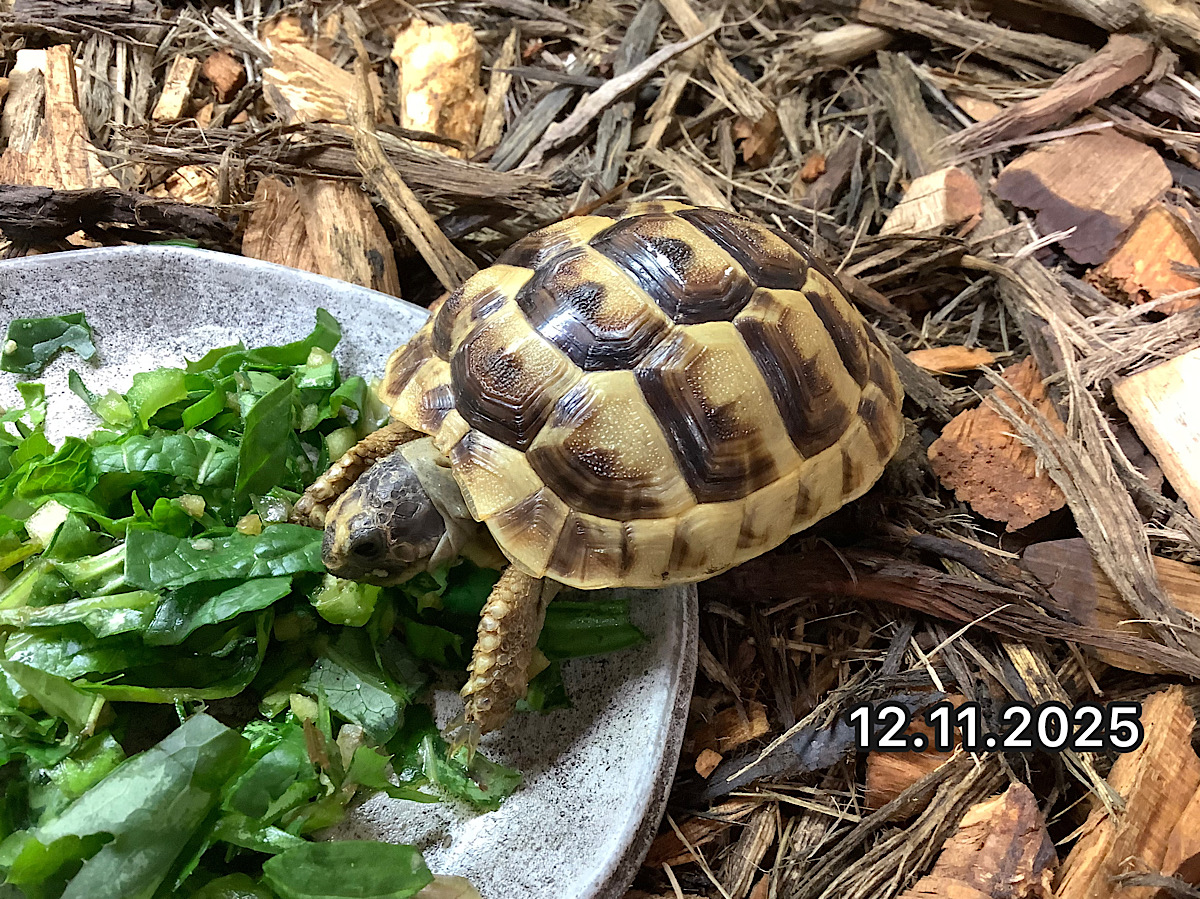 ギリシャ西部の山岳地帯より名前をとってアカルナニア君。11時~ソーラーラプターの真下で日光浴/体温上げ上げ、12時~エサはないのかと歩き回る、13時~まだエサは来ないのかとかめぢからベースに登って飛び降りて登って飛び降りてを8周くらい繰り返し…エサやり→今HPに掲載されている写真の撮影(;’∀’) こんな日々を過ごしています。小学生のこぶしくらいの大きさ、頑丈ベビーからの飼育スタートでこれからの未来、どんどん成長していく姿をがっつり楽しめます。エサ食い絶好調、ノゲシ、タンポポ、小松菜などにサプリメント(セラレプティファイバー等)、リンゴみじん切りミックスで与えています。