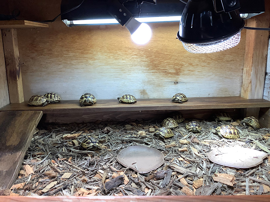 このケージに設置してあるベース陸型は奥行13.5㎝×幅92㎝、スロープ部分が幅13.5㎝長さ30cmほどなので合わせて1650㎠である。つまり92㎝×奥行60㎝のケージに40㎝四方のサイコロ水槽が合体した広さとなる。40㎝四方の広さの割り増しは大きいぞ。各個体ベースに登ったり、歩いたり、日陰に身を隠したり、日光浴をしたりそれぞれが快適に生活している。カメにやる事(できる事)を与え個体間のストレスを軽減する、これがかめぢからベースの効果である。飼育については、かめぢからのリクガメの飼育方法を隅々まで読んだ上で、かめぢから飼育セットでセッティングまでオーダーすると良いだろう。