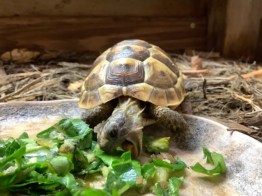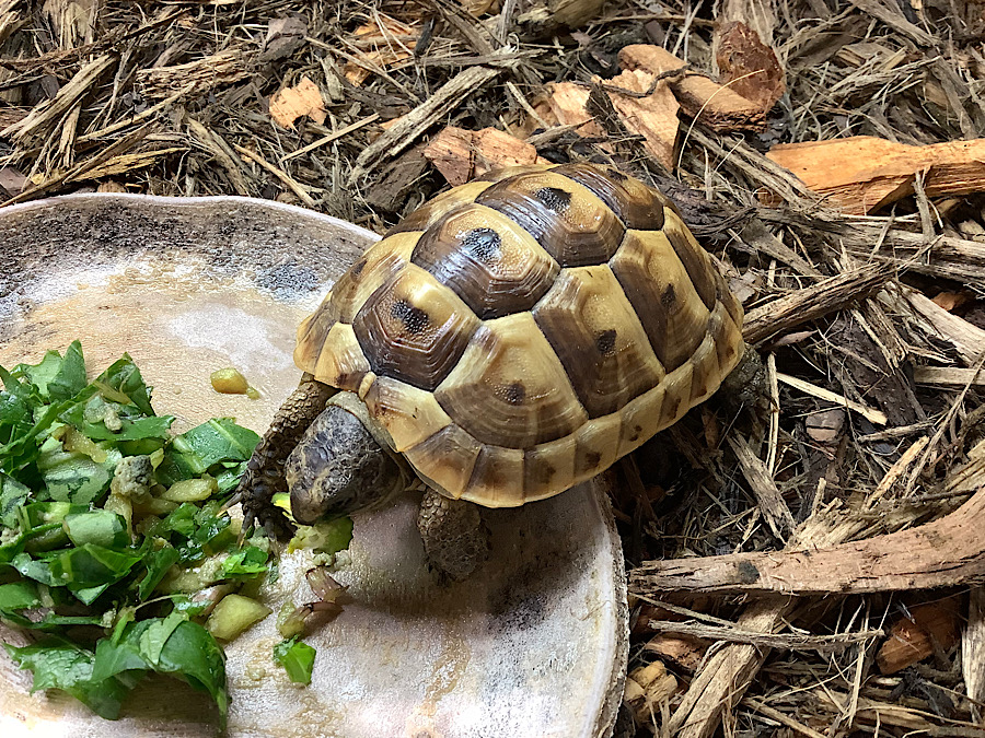 旧イベラギリシャギリシア産。こちらはギリシア、ピンドゥス山脈系のティムフィ山から命名した個体です。ティムフィさん。黄色味が強く明るめの個体で色彩で言うとアラブギリシャっぽい雰囲気を醸し出してくれています。大口を開けてエサを食べる姿からはイベラならではのパワフルさを感じますね。かなり大食漢なカメたちですが、エサさえしっかりと与えておけば20個体近く同じケージで飼育しても問題は起きていません。かめぢからベース陸型で高低差と移動面積の増設をし、どの個体もメキメキと成長しております。かめぢから飼育セット/ベース付で2,3個体飼育すると面白いでしょう。