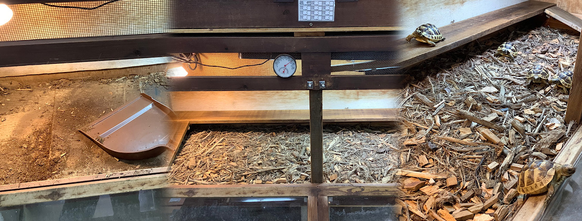 このケージに設置してあるベース陸型は奥行13.5㎝×幅92㎝、スロープ部分が幅13.5㎝長さ30cmほどなので合わせて1650㎠である。つまり92㎝×奥行60㎝のケージに40㎝四方のサイコロ水槽が合体した広さとなる。40㎝四方の広さの割り増しは大きいぞ。各個体ベースに登ったり、歩いたり、日陰に身を隠したり、日光浴をしたりそれぞれが快適に生活している。カメにやる事(できる事)を与え個体間のストレスを軽減する、これがかめぢからベースの効果である。飼育については、かめぢからのリクガメの飼育方法を隅々まで読んだ上で、かめぢから飼育セットでセッティングまでオーダーすると良いだろう。