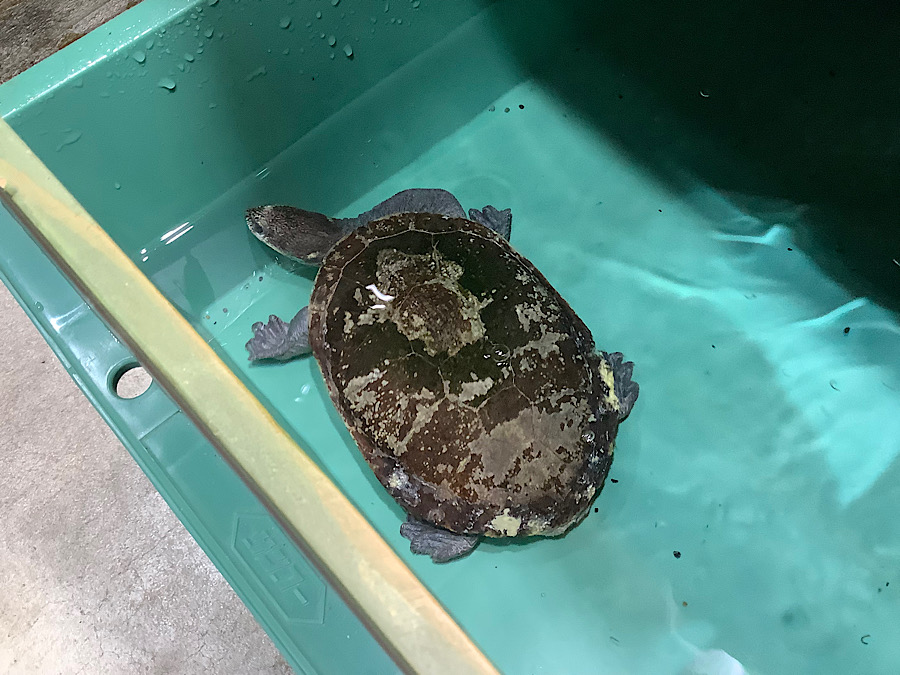 水の汚れや個体の状態を見て週3回ほどエサやり。冷凍アジ、ワカサギ、きびなご、金魚、貝のむき身、砂肝などを与えています。夏場は屋外飼育、冬場はかめぢからバックルームで育成中です。週1くらいで水替え、セラアクタンにて水質調整。140㎝タフ舟で繁殖が狙えそうです。