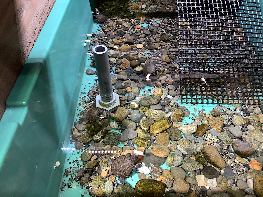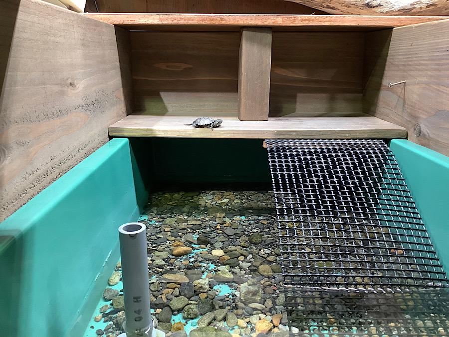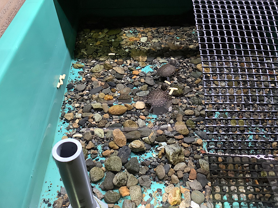 週5日ほどエサやり。エサの食べ残しで水が汚れないようにラフィPを二つ折りにした小スティックにて給餌。エサへの反応はとても良いです。かめぢからオリジナルの砂利を敷いた状態で水深は3㎝くらい、ライト点灯11時、12時半頃にラフィP natureを与え16時頃に乾燥エビを与えます。水替えは週1ペースで行っております。