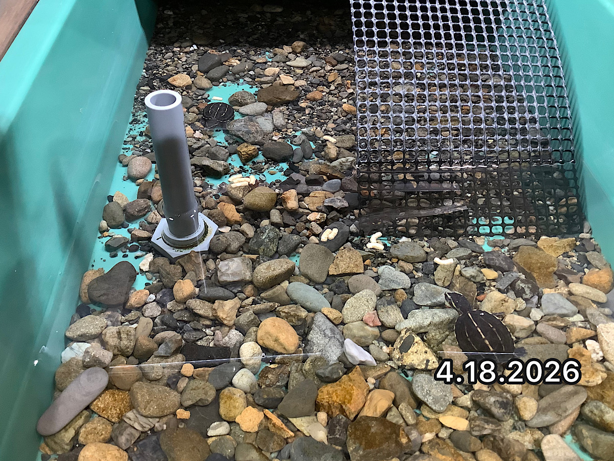 弐を掲載。輸入して間もない時はベースの陰に隠れていることが多かったが、最近は水槽内を動き回っている。手前に来て様子をうかがっていたりベースの上に登って日光浴もする。夜、電気が消えた後はキボシヌマガメ全個体がベースの上に登って夜の甲羅干しの真っ最中だ。日光浴と言いつつ、ミズガメこのように夜に上陸して甲羅干しをしていることが多い。かめぢからナイトツアーができるのはオレの特権である。閉店後、電気を消してお店をクローズして終わりではない。電気が消えた後も懐中電灯片手にカメの行動をチェックして分析するのはプロとして当たり前。オレは他みたいに軽い気持ちで仕事してねえから。