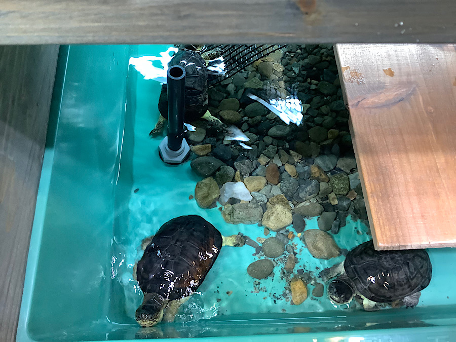 全ミズガメの中でも最小クラスのヒメハコヨコクビガメです。ペア取り可能です。私的にはフルアダルトサイズでも平均してミシシッピニオイガメよりも小型だと思います。甲羅に高さもボリュームもない事を考えると非常に小さく、スペースを取らないので飼育しやすいミズガメの1つではないでしょうか。配合飼料、乾燥エビ、煮干しなどを与えています。とりあえず水面に何かを投げ入れればエサと思って食いついてくるほど慣れています。