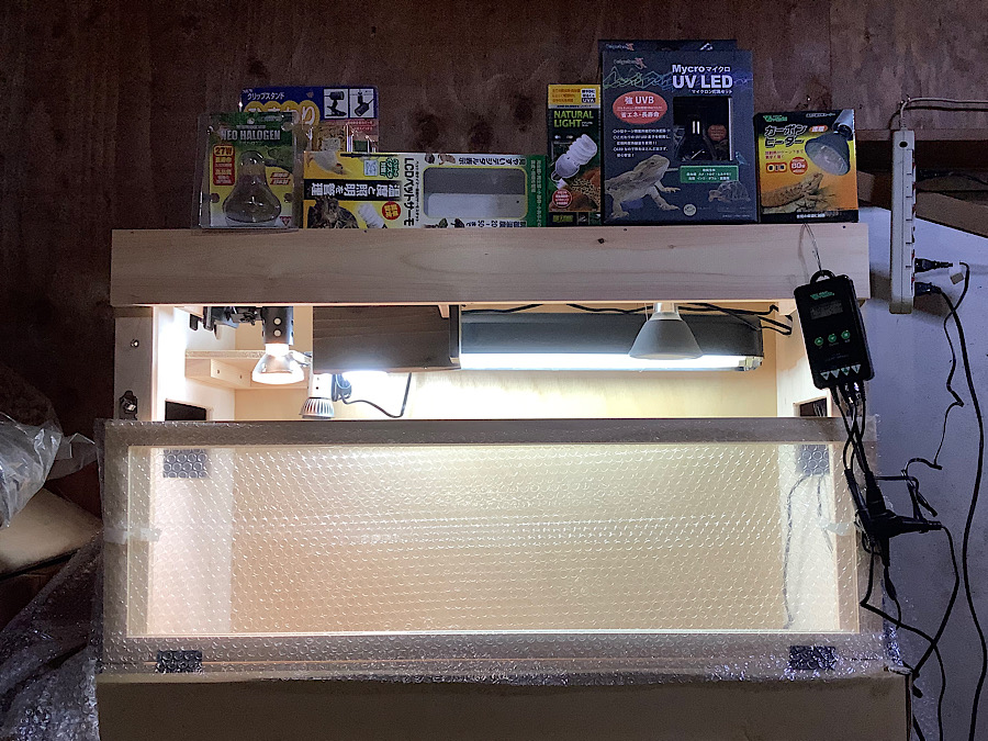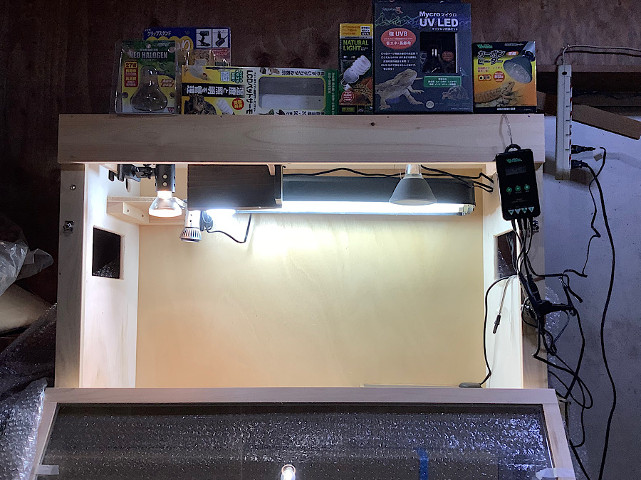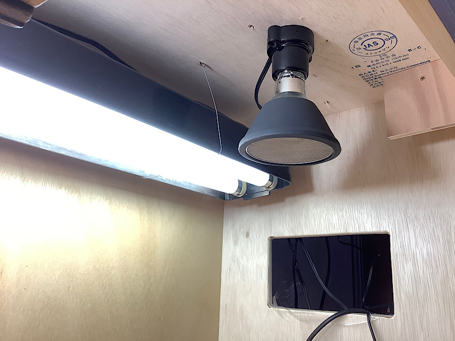 冬場の日中保温におけるサポート的要素、夜間におけるメインの保温器具となります。通常は暖突Lですが、安さを追求したためカーボンヒーターとなっています。暖突Lより保温範囲は狭いですがワット数は高いのでスポット的ではありますがかなり暖かくなります。サーモスタット繋げて放熱をコントロールします。