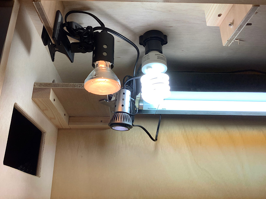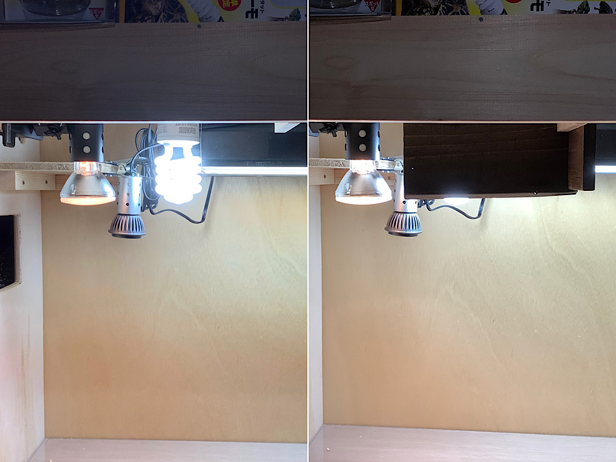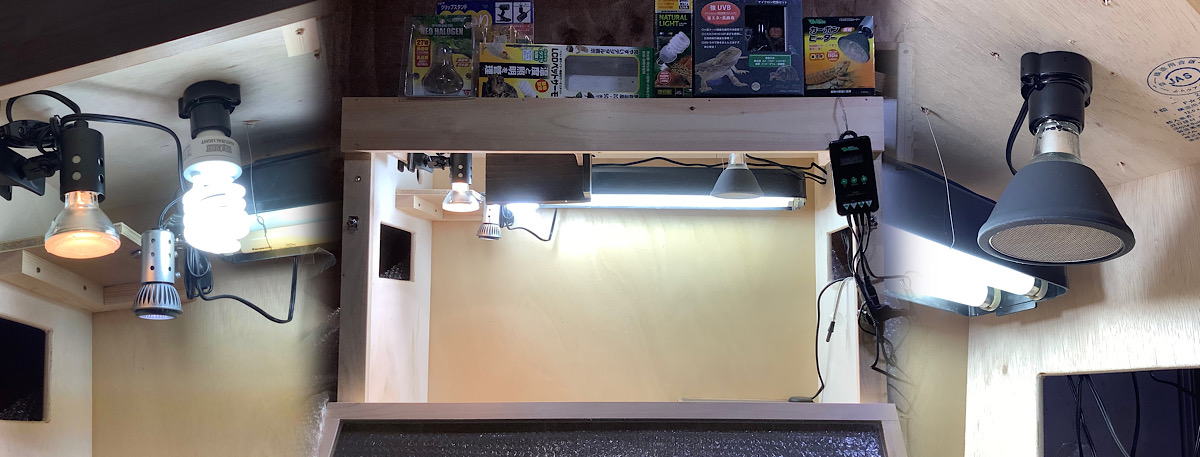ケージの一部分により明るい光を照射し、リクガメの活性を高めます。今回のOLD&NEW仕様ではマイクロLED UVB、ハロゲンライトと光を重ね合わせてホットスポットを作ると良いでしょう。上記のコード付きソケットE26にはめ込みます。