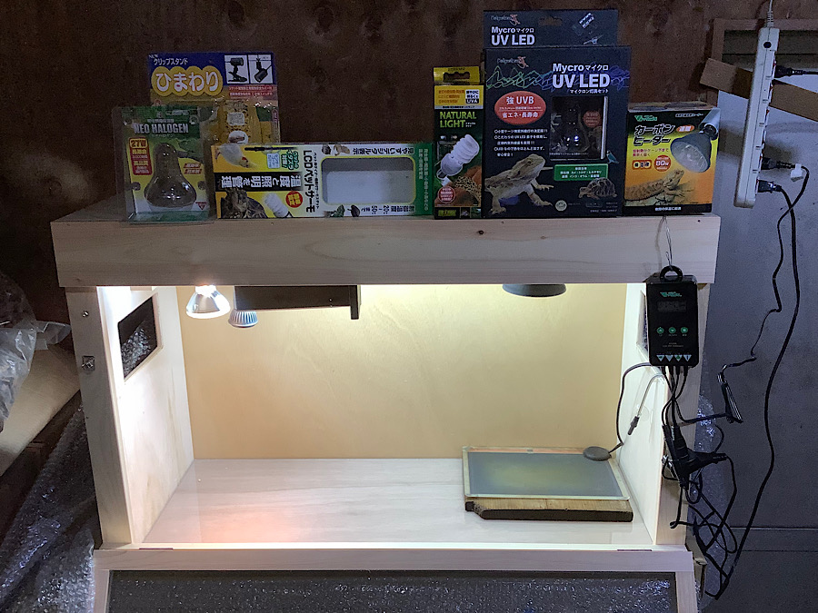 オプションのかめぢからベース陸型を追加して飼育を始めるとより一層よいだろう。スーパー1の使い勝手の悪さについてはよく考えてみてくれ。かめぢから店内では20個くらいのスーパー1をケージ底部に両面テープで固定し、上から力土を敷いて使っていたが、20年以上何の事故も火事も起きていない。ただしPVCの上にスーパー1を置くと熱でPVC板が変形するから厚木を挟むのは必須だと思う。今回組み上げたかめぢから飼育セットに質問がある客人はお気軽に問い合わせてくれ。売れるまでは実物を展示中なのでお店まで見に来てもいいぞ。