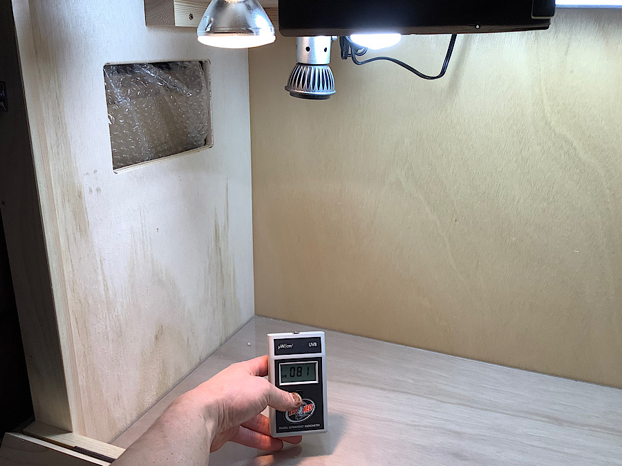 非常にコンパクトなUVBライト。可視光線としての光は微弱で大した明るさではありません。しかし放出されるUVBは非常に強く、10㎝の距離で900弱、40㎝の距離で100前後を計測します。同測定器で真夏の快晴、昼13時太陽からの直射日光でUVB値250前後と言う計測を考えると小型ながら非常に強いUVBが出るライトです。照射する範囲はそれほど広くないので、ハロゲンライトの光などと重ね合わせ、カメが日光浴に来る際にたくさんのUVBが当たるようにしてあげましょう。かめぢから店舗ではメタハラが入らない高さのないケージや、仕切り板をしてスペース制限をしているケージなどに多数設置しています。1日9時間点灯で3年使用してもUVBはかなりの有効値を維持しています。電気代も安く、明るさを他のライトで補えばUVBライトとして最も優れている物の1つかもしれません。