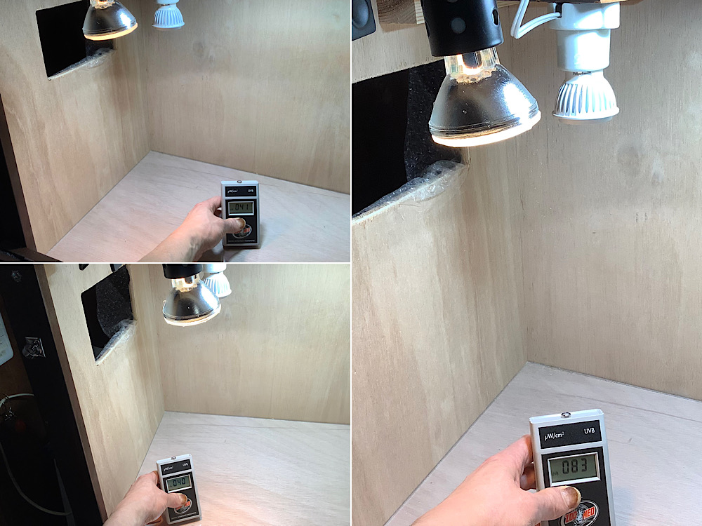 オプションのかめぢからベース陸型を追加して飼育を始めるとより一層よいだろう。マイクロUVB LED(E26)はギミックで円を描くようにスライドして動かせるようになっている。ベース陸型を付ける場合はライト照射をやや後ろ側にしてベースにリクガメ君が登った時、高い位置で光が当たるようにしても良いだろう。照射距離が10㎝近くなるだけで降り注ぐUVBの数値は1.5倍くらいになったりする。マイクロUVB直下でUVB量80前後、同計測機で本日2月19日2026年快晴12時30分の太陽光直射日光でUVB量95であった。マイクロUVB真下からずれても直径30cm前後の範囲でUVB40前後が降り注いでいる。下の写真を参考にしてみてくれ。底面ヒーターのピタリ適温プラス2号の保温力が心配な場合はマルチパネルヒーター32W(¥6800-)に変更可能。カミハタテラリウムサーモは現在では市販されていないレア物だ。温度調整はダイヤル式で、精度は現在主流のデジタル式よりも劣る。しかしこれで十分。オレなんて飼育にサーモなど1個も使わない(かめぢから飼育生体にサーモを使っているケージ、水槽は1個もない)。全部オレの肌感覚とカメの動きを見て適温か否か見極めている。
