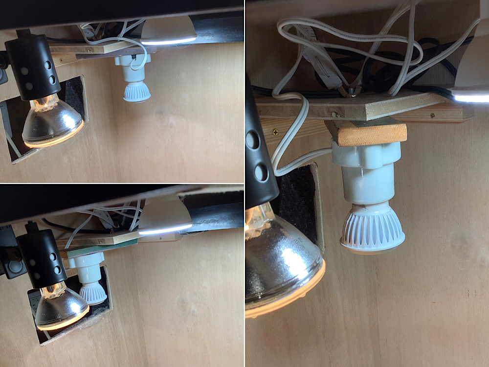 通常はクリップスタンドひまわりや同性能のソケットを使う所、安さを追求したため、こちらのソケットをDIYにてかめぢからケージに取り付けました。ボタニーライト用、マイクロUVB LED(E26)用として固定設置で2個ついています。