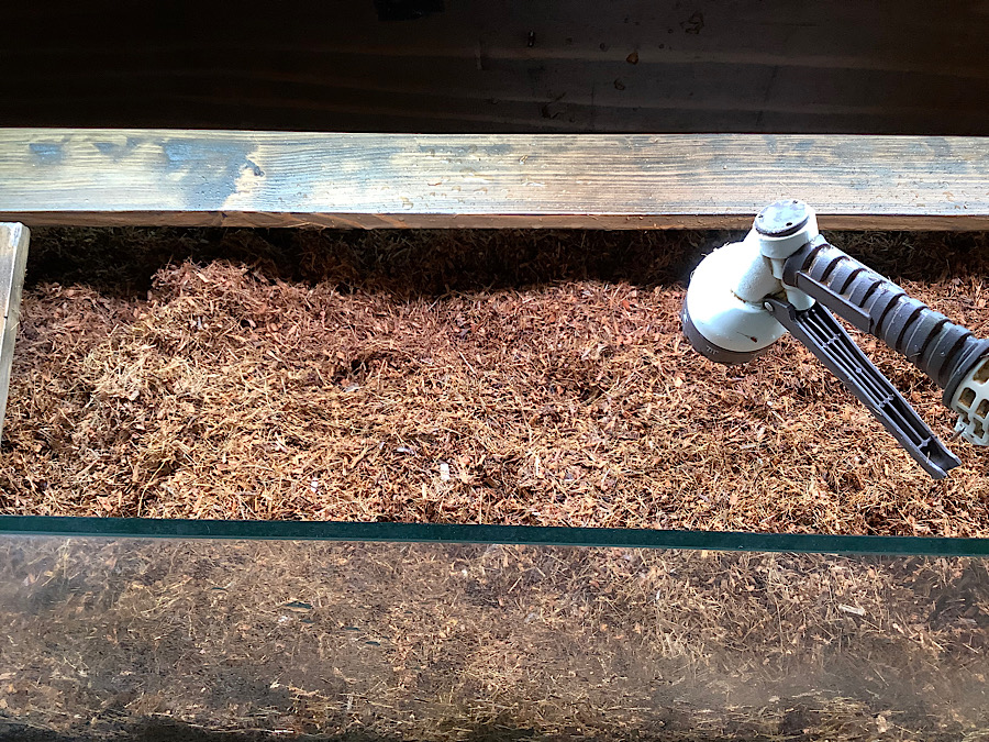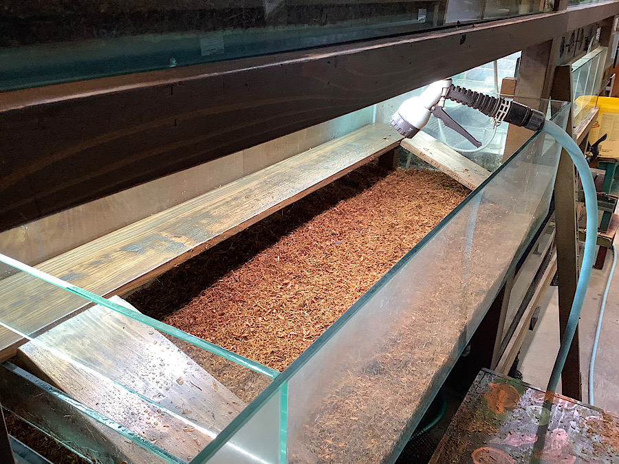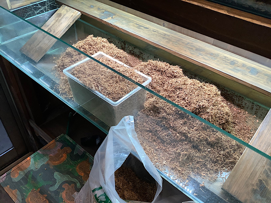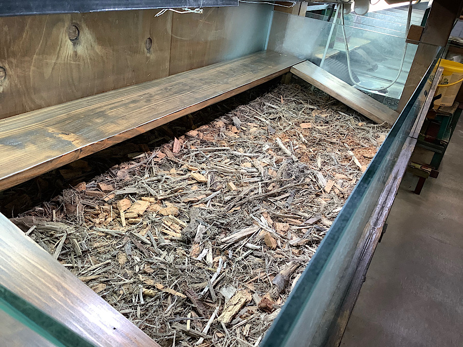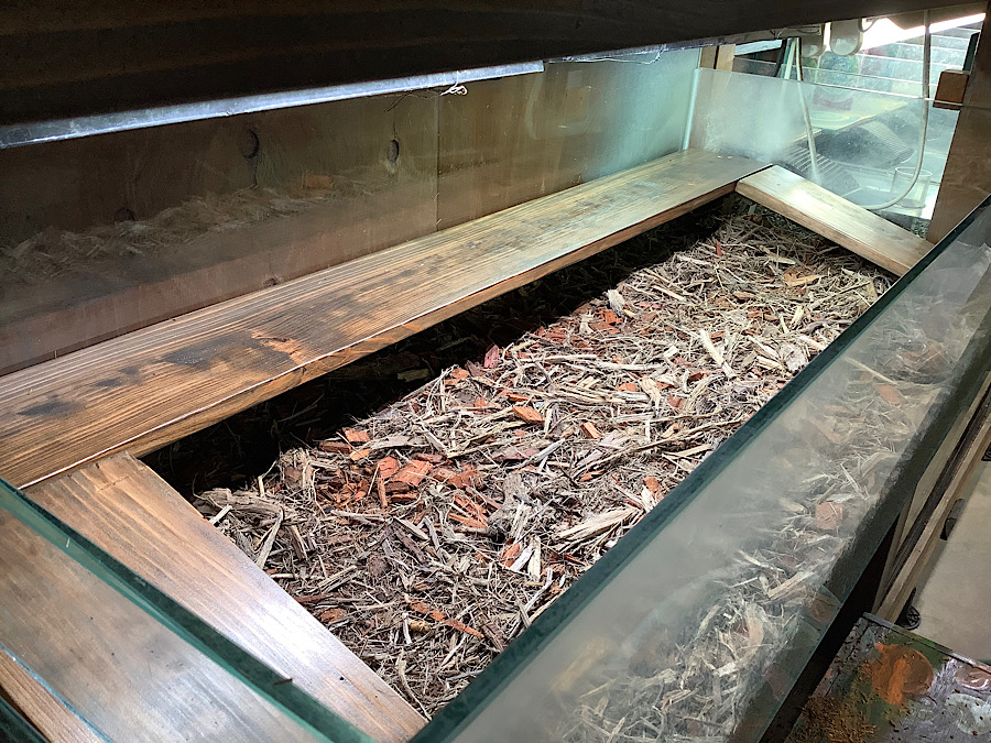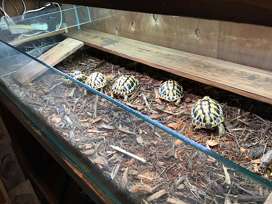 2日経過して湿り気が無くなった状態がこんな感じである。ベビーから育ってきて90㎝ケージでは手狭になってきたヒガシヘルマン君たちをこちらの120㎝×45㎝ガラス水槽に移し替え。かめぢから入口ではヒガシヘルマン君とビルマムツアシ君、セマルハコガメ君とモエギハコガメ師匠が皆さんをお迎えいたします。新しい飼育環境の立ちあげ、床材の品質チェックも無事に終わった事だしハンバーグでも食いに行くかな。