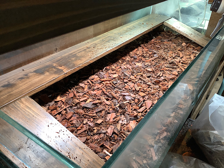ココパーム微細を敷き詰めたら力土COATを表面に敷き詰める。今回はチップのサイズ、発酵具合、色、質感、全てパーフェクトな感じがする。それでは実際に開封して使ってみよう。
