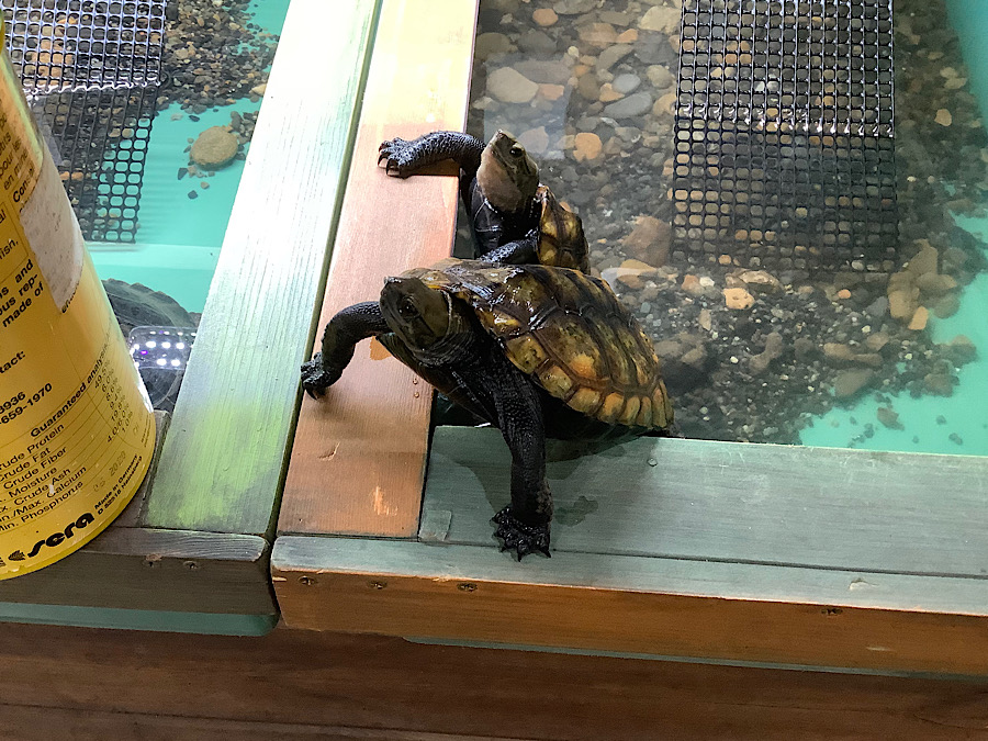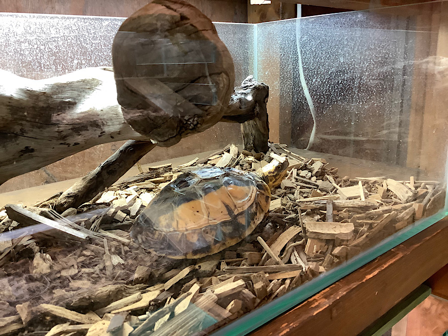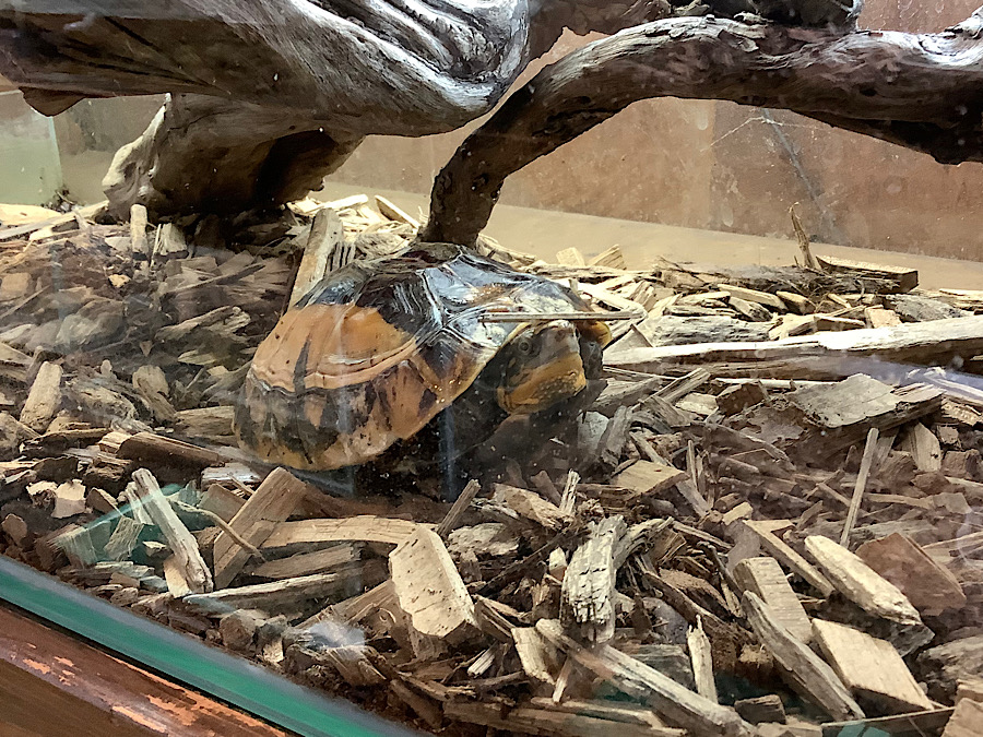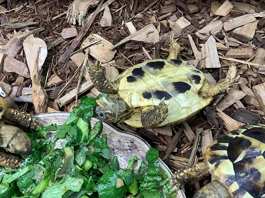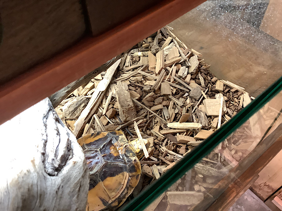 どうしてこんな状況になったシリーズだ。頭の上にチップをバランス良く乗せてボケーとしてる。これ、結構多い。店内のリクガメでも何回か見かけたことがある。カメと言うのは非常に優れたバランス感覚で生活しているのだと推察できる。基本左右にブレない、前後ろにもブレない、一切無駄のない動きで生活しているのではないだろうかと推察できる。エネルギー消費を抑えて細胞レベルで老いを遅らせているのではないだろうか。それ故、どの種類も寿命が長いのかもしれない。