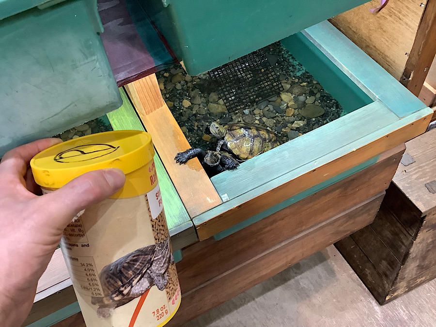 かめぢからでは毎日楽しいカメの行動が観察できています。因みに誰にでもこういった動きを見せるわけではありません。店内にお客さんがいるといつものように出てこない個体も多いですし、エサを与えても少しだけ食べて隠れてしまう個体も多いです。つまりカメは人間の識別ができているという事です。これは間違いありません。顔を覚えているのか、シルエットでわかっているのか、少なくとも洋服の色などではありませんね。カメボスはいつも違う柄のTシャツを着ていますが、カメボスには皆懐いていて毎日飛び出て来ますからね。かめぢから研究ではカメは非常に目が良いので恐らく人間の顔を認識できていると考えています。