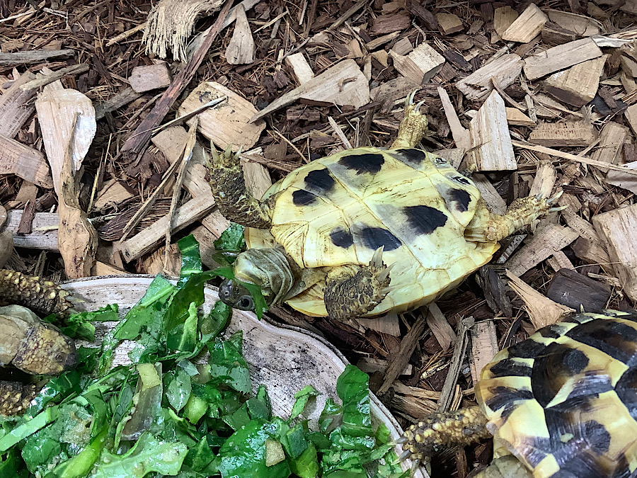 ひっくり返ったままエサを食べるヒガシヘルマン君。起き上がる事よりもエサを食べることが優先されるという非常に珍しい光景だ。エサは定休日以外ほぼ毎日与えている。エサを1週間に1回しか与えないからものすごくお腹がペコペコとかいう状況ではない。このような行動に至る経緯を推察してみよう。カメたちは幸せで安心しているのである。かめぢから店内ではひっくり返っても命の危険がない事を知っている。ちょっともがけばすぐに起き上がれるし、外敵には襲われないし、安心なのだ。優先順位としてはエサを早く食べないと周りの個体に食べれられてしまう、起きるのは後だ。と言う状況になっているのだと考察できる。だが、この考察も実はちょっと違うかもしれない。実は昨日モリイシガメが同じ状態でひっくり返ったままエサを食べていた(写真は撮っていないが)。モリイシガメはすべて単独飼育中で別にエサを他の個体に取られてしまう心配はない環境に置いている。それでもひっくり返って起きる事よりもエサを食べることを優先していたわけだ。という事でとにかくエサに夢中、お腹が空いていてオレのエサをやる回数や量が少ないのかもしれないと心配になってきた(;’∀’)