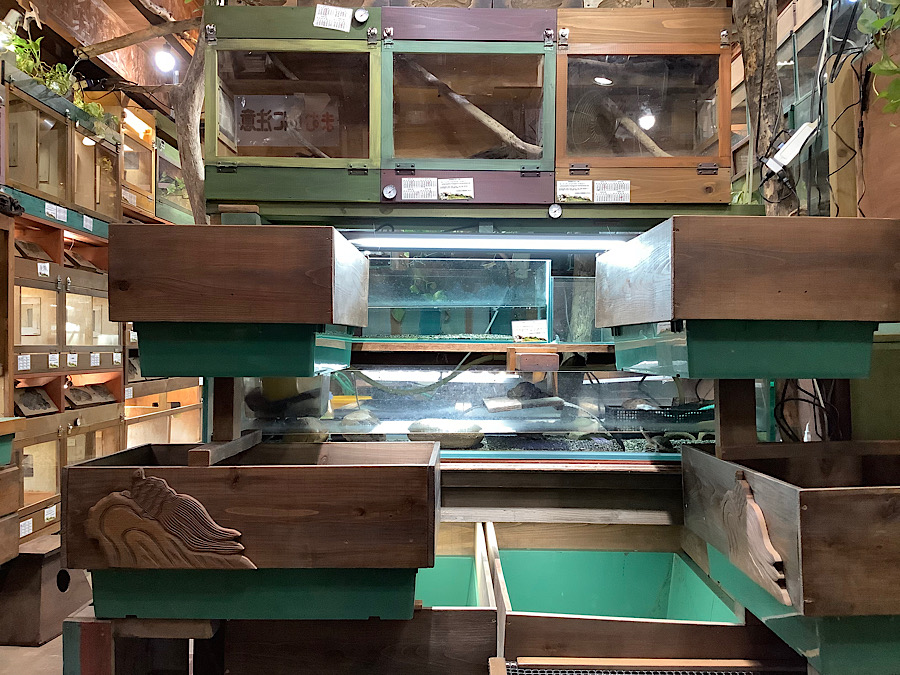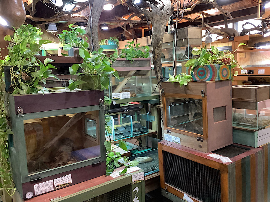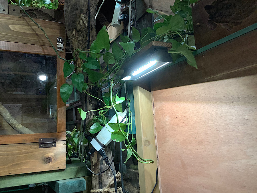 最後は細かいライティング。全体照明の明るさはOKとして紫外線UVBがほぼゼロなので各所にBarTypeソラリウム、マイクロUVBなどを設置して紫外線を当てる。これらライトは店内のどこか使ってないケージから持ってくる。新品を下ろすなどもったいない。あるモノで何とかするのだ。