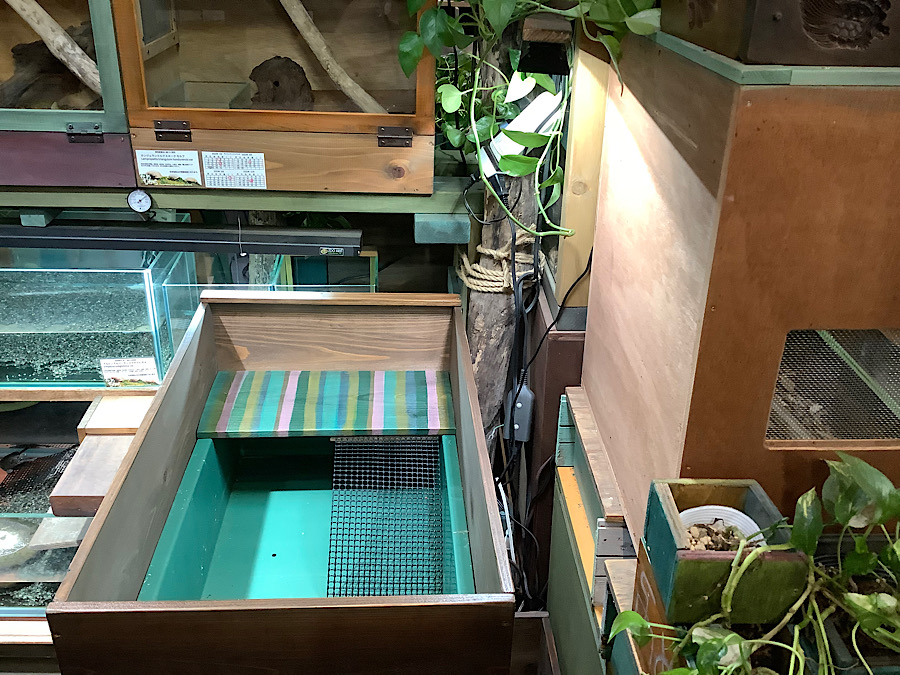 と、言う事で年末年始のペットホテル用に90㎝サイズエンクロージャーが4つ確保できそうなので安心、店主は自分の世界へ走っております。前回はココまで作業を勧めましたね。コーンスネークを飼育していたケージをどけてミズガメ用の大型タフ舟を2つとハコガメ用/ミズガメ用かめぢからベースG型。