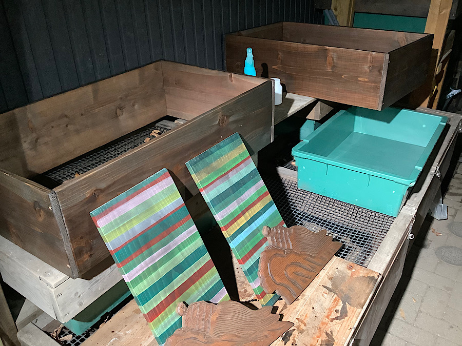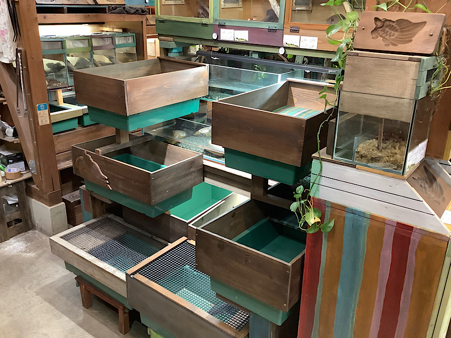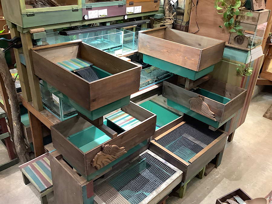 深夜3時過ぎまで塗装作業したり。各エンクロージャーを支える骨組みを使い回しの木材で無駄がないようにまとめた(いちいちコレ専用の棚などは作らない)。かめぢからベースG型とタフ舟などの囲いを作る木材以外はタダ!台なんかもコーンスネークケージに使っていたものを流用だ。単に使いまわすだけだと段差などが出てしまうので木片などで細かく改修して高さや位置合わせ、積み重ねたエンクロージャーがしっかり水平になるように手入れをたくさんした。在庫の変動によってヘビコーナーにいつでも戻すことが可能だ。