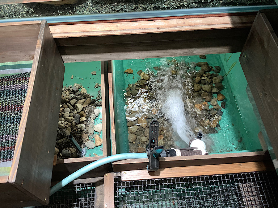 最後に水を入れてカメを入れる準備だ。夏の間外に出してあったアフリカのハコヨコクビガメ君達を少しずつ店内に戻していくぞ。