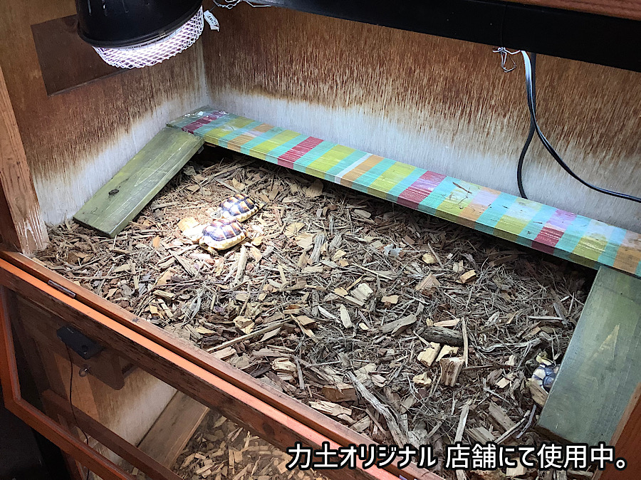 力土COATと力土2O24の混合だ。下地にはココパーム微細。こんな感じ、こんな見栄え。店舗マルギナータリクガメがいるケージの床材が力土オリジナルとなっている。撮影のためセッティングしたわけではなく、半年くらい前にセッティングしたものである。
