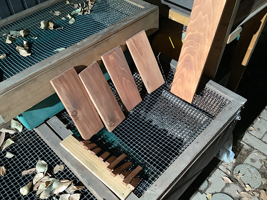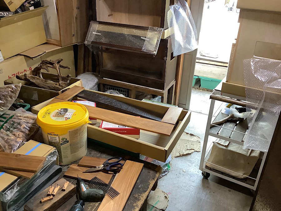 今日は1日に2個のケージセッティングという事であらかじめ工具や木材などを用意。ケージただ置くのとセッティング用に置くのでは、使うスペースが全然違う。セッティング待ちのケージが2個もあると足の踏み場もない(;’∀’)